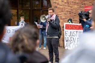 English 14 november 2025 Departing lecturer Harry Pettit at support demonstration: ‘They were never able to explain what rules I had broken’