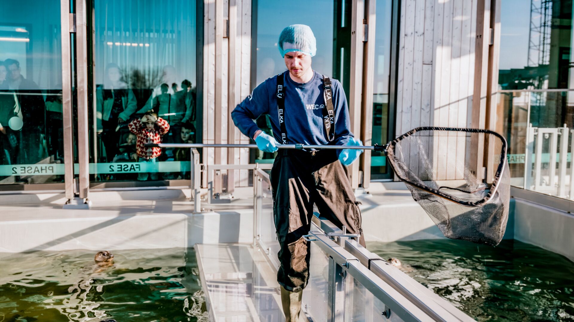 Terwijl hij praat, hijst Koen de Reus zich in een waterdichte overall en trekt hij laarzen aan. Een verslaggever van Vroege Vogels heeft zich gemeld; die wil geluidsopnames maken van het voeren van de zeehonden. En dus sjouwt de onderzoeker twee emmers haring naar een bassin. ‘Dit is samen acht kilo’, zegt hij in de microfoon van de radioverslaggever.