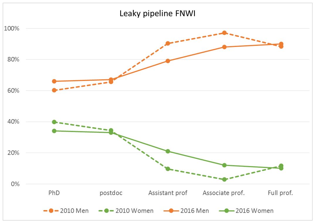 Binnen de bètafaculteit is er de afgelopen paar jaar veel veranderd en er is nu een actief genderbeleid dat breed gedragen wordt door de instituten. Ik denk dat we daarmee het lek in de pijplijn voor universitaire docenten, universitaire hoofddocenten en hoogleraren gedicht hebben, maar we zullen de komende jaren moeten blijven oppassen voor nieuwe lekken. Het percentage vrouwelijke hoogleraren zal de komende jaren ongetwijfeld weer gaan stijgen, mede dankzij de goede maatregelen van minister Bussemaker.