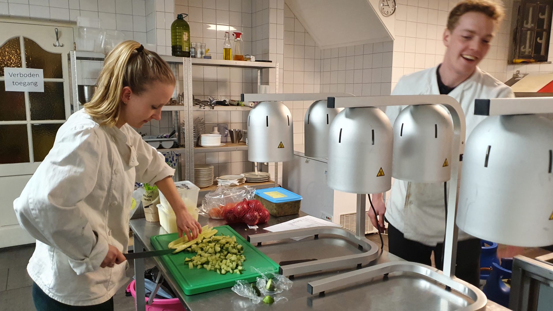 Vroeger zat op deze plek aan het Kerkplein muziekcafé De Muse. Tot het pand tegen de grond gaat omdat er appartementen verrijzen doet het dienst als pop-uprestaurant Bobbies. En nu, tot 26 maart, mag Happietaria het dus gebruiken. Veel van de ingrediënten waar de studenten mee koken, worden gesponsord door lokale ondernemers. Vis en verse kruiden komen uit Malden. ‘De thee die we schenken krijgen we bijvoorbeeld van Het Theezaakje in Nijmegen.’