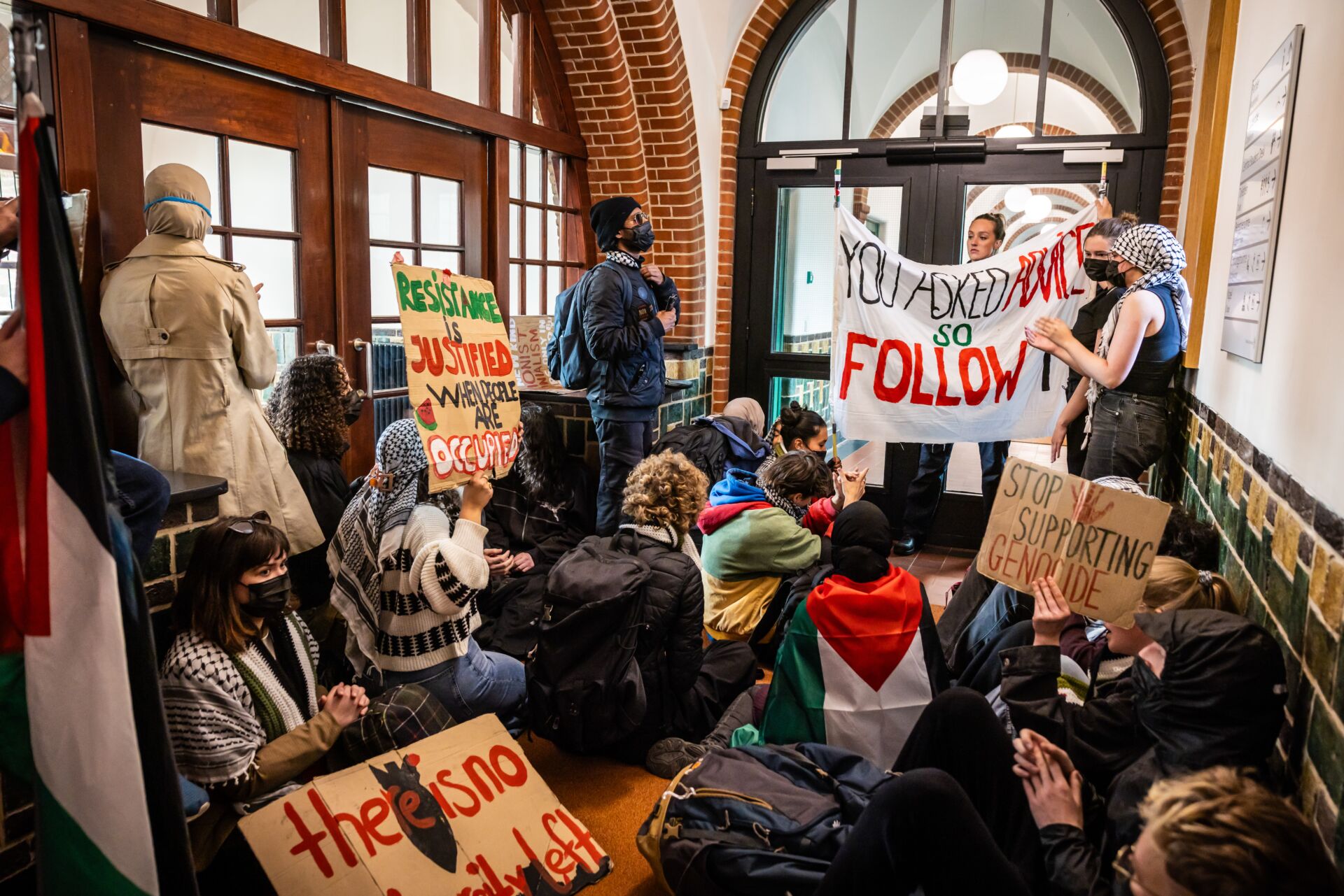 The student showed up too late and was therefore unable to join the march. University president Alexandra van Huffelen met the group at the entrance of the administration building but ended the conversation when some protesters covered their faces. When she walked inside, a few of them followed.