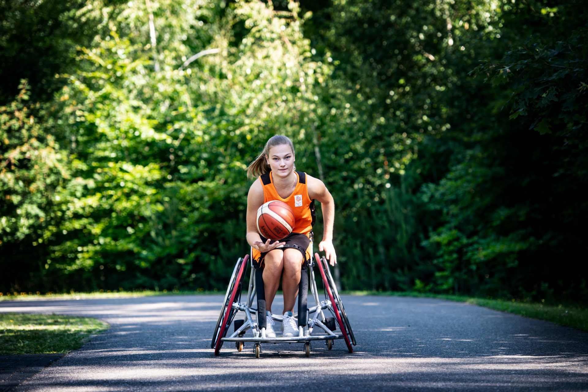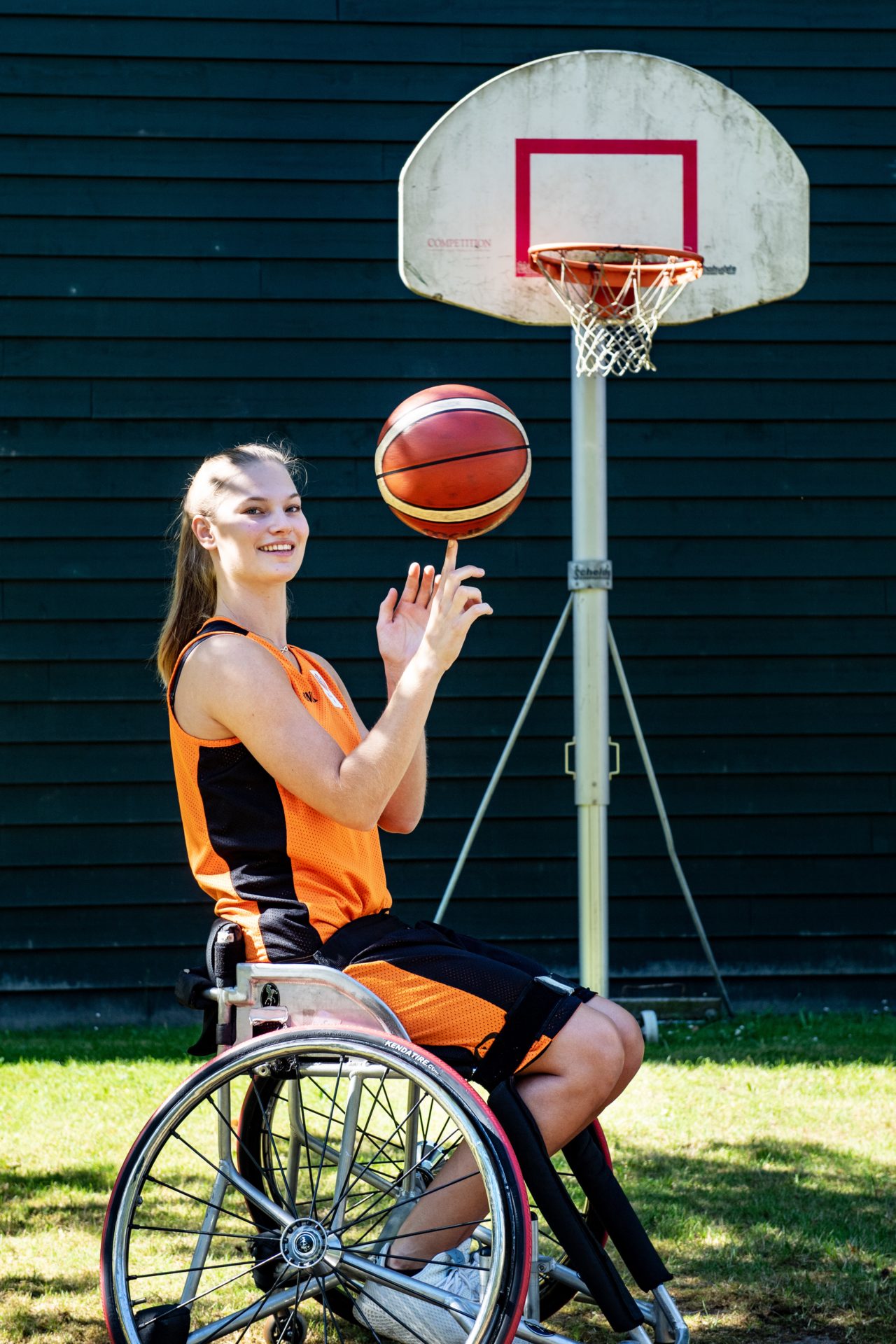 ‘It all looked very rosy at the time,’ she says on a sunny June afternoon at the Papendal elite sports training centre, nestled in the Veluwe forest on the outskirts of Arnhem. She has come outside with her sports wheelchair and a ball and points to an old basket behind the main hall where she has recently resumed her training. Outsiders, like the photographer and interviewer, are not allowed inside yet. Still able to show off her skills, however, she tosses the ball into the lopsided basket.