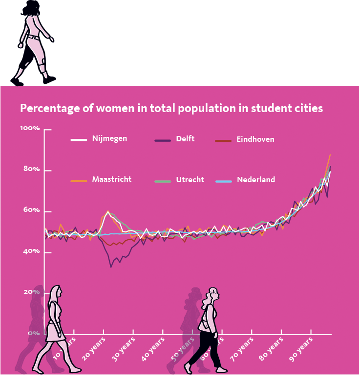 In a small city like Nijmegen, you notice this difference immediately in the city’s population. In Nijmegen, there are 106,7 women for every 100 men. Compare that to the rest of the Netherlands: 101,55 women for every 100 men.