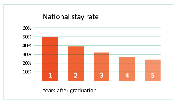 For the past few years, Nuffic, the Dutch organisation for internationalisation in education, has mapped how many international students remain in the Netherlands after graduation. This is becoming more relevant as the number of international students continues to grow. It would be a pity to see all these talented people leave the country as soon as they graduate. The Dutch government couldn’t agree more, and last year’s coalition agreement included the intention to make efforts to retain international talent in the Netherlands. Nuffic published new figures today on internationals who graduated in the Netherlands between 2006 and 2013. Nuffic follows students for five years after graduation, which is why more recent cohorts are not included.