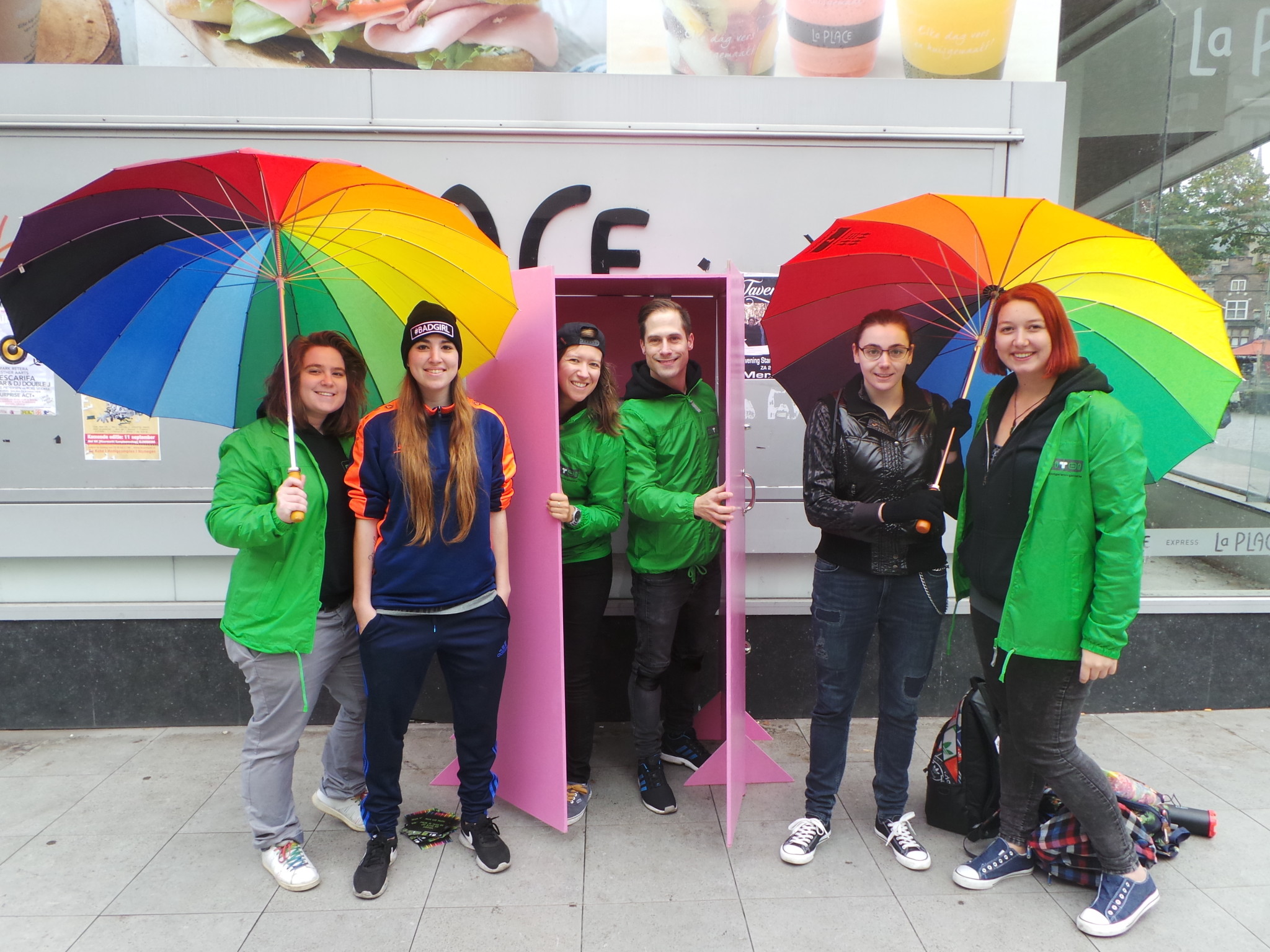Een grote roze kast op de Grote Markt. Het is een kleurrijk gezicht op een verder grijze dag in het centrum van Nijmegen. Een aantal stappen dichterbij wordt duidelijk dat homojongerenorganisatie Dito! erachter zit. Ter ere van de internationale Coming-Outdag is er vandaag de mogelijkheid voor nietsvermoedende Nijmegenaren om uit de kast te komen. Daarnaast zullen er vandaag op Dito!’s Facebook-pagina meerdere verhalen verschijnen over hoe men uit de kast is gekomen.