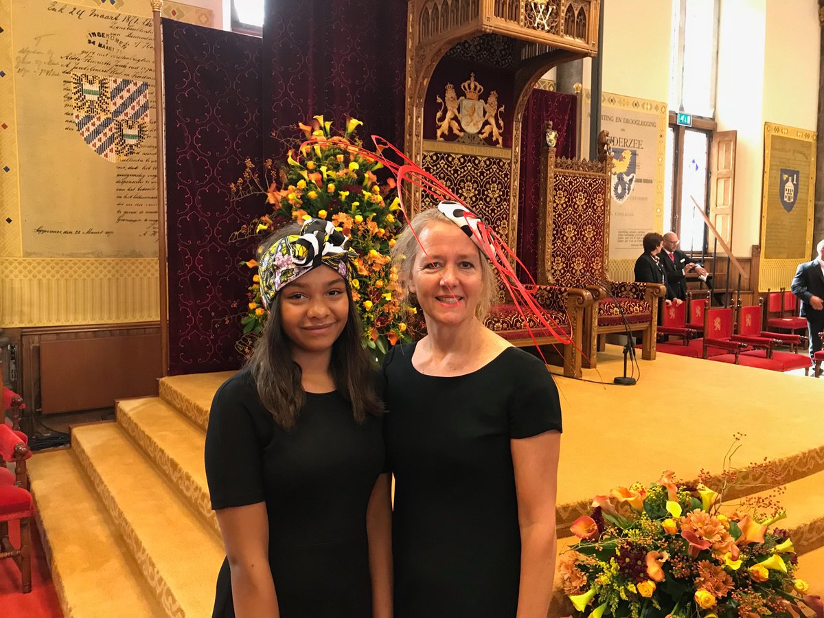 Esther-Mirjam Sent met hoed en dochter in Ridderzaal