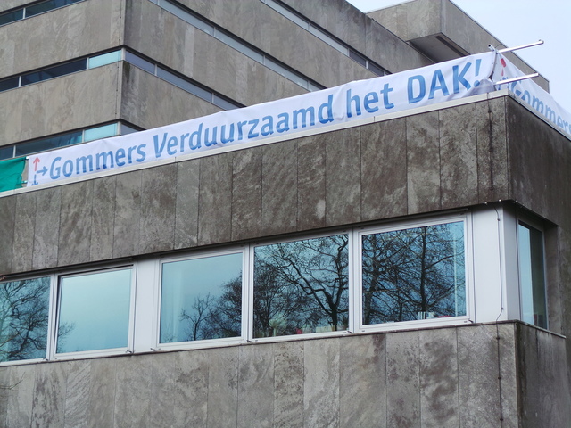 Installatiebedrijf Gommers is gestart met de drie maanden durende operatie om het dak van de universiteitsbibliotheek te voorzien van zonnepanelen. Studentenfractie Akkuraatd – verduurzaming van de campus is een van hun speerpunten – deelde vandaag rond lunchtijd thee uit om aandacht te vragen voor de extra duurzame energie. Met als knipoog de spelfout op het spandoek van Gommers, die het presteert juist bij de universiteitsbibliotheek te melden dat het bedrijf het dak ‘verduurzaamd’.