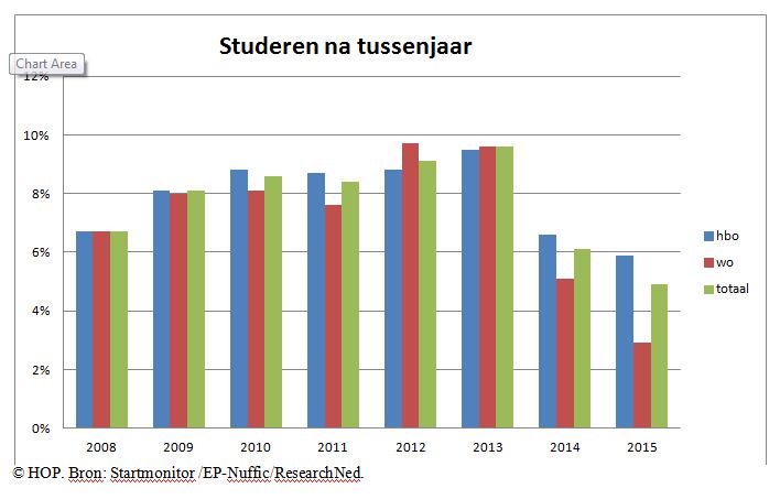 Van de huidige eerstejaars heeft slechts één op de twintig zo’n tussenjaar genomen. Deze jongeren gingen er een jaar tussenuit en namen op de koop toe dat ze geen basisbeurs meer zouden krijgen. Opvallend genoeg hebben vooral universitaire studenten hun tussenjaar laten schieten: slechts drie procent van de eerstejaars durfde het nog aan. Met name aankomende juristen en studenten van groene opleidingen kozen zelden voor een jaar reizen of werken (minder dan twee procent). Studenten van opleidingen in de talen en cultuur lieten zich iets minder vaak afschrikken (4,6 procent).