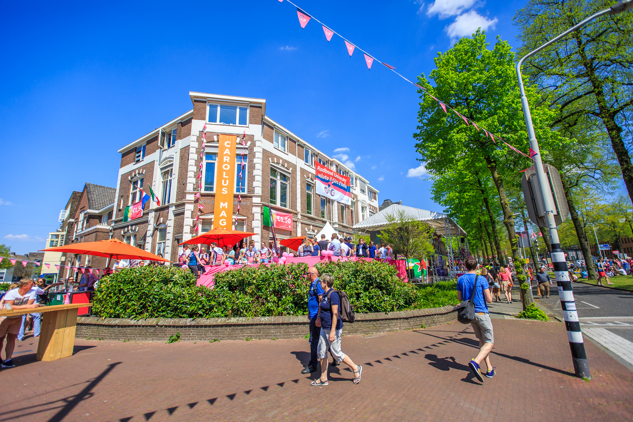 Het grootste wielerfeest van de stad vond plaats aan de St. Canisiussingel, waar Ovum Novum en Carolus Magnus een groot podium bouwden voor hun sociëteiten. Dat was een succes. ‘Het was geweldig. De sfeer was zo goed dat we zaterdag tot middernacht buiten zijn door gegaan’, zegt Dennis van der Vegt, praeses van Ovum Novum.