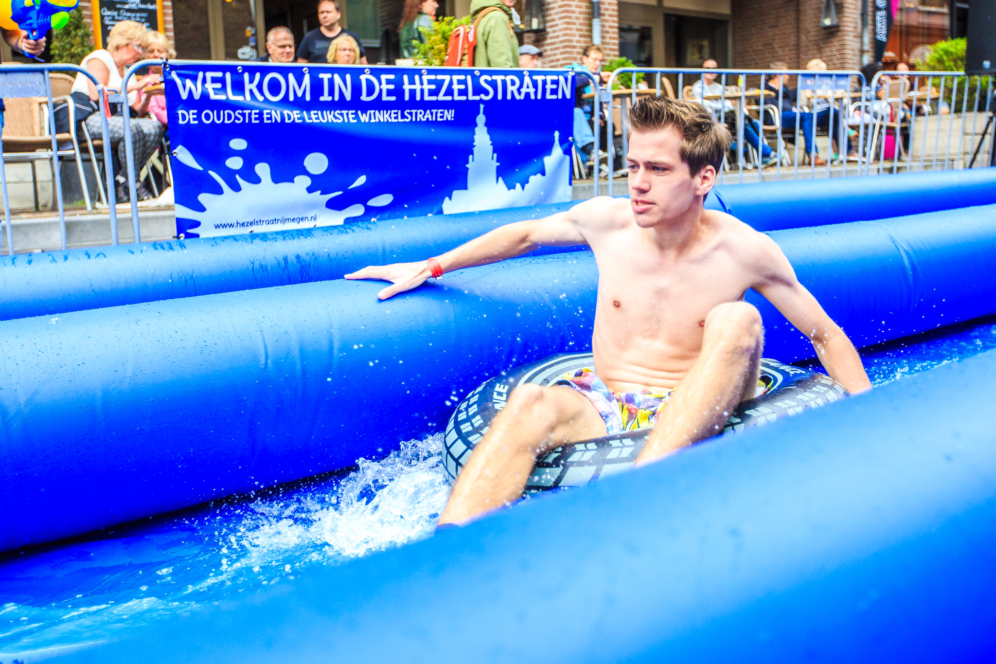 Wie dit weekend op de Grote Markt staat, kan er niet omheen. Tot en met zondag start daar Splash Nijmegen. Een lange glijbaan recht door de Stikke Hezelstraat, compleet met muziek, publiek en alles wat erbij hoort. Degenen die zich hebben ingeschreven kunnen urenlang met een opblaasbare band van de glijbaan.