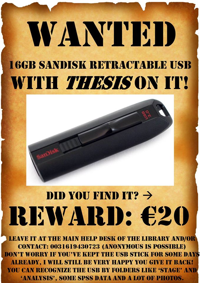 Pas afgelopen maandag kwam Sebastian erachter dat hij de USB-stick kwijt was. Hij is toen meteen naar de UB geracet, maar daar was de stick nergens meer te bekennen. Een dag lang heeft hij in paniek over een oplossing zitten denken. Nu heeft Sebastian posters opgehangen waarin hij twintig euro uitlooft voor de eerlijke vinder van de beruchte USB-stick. ‘Voor dit geld kun je twee USB-sticks kopen, dus waarom zou de vinder mijn USB-stick zelf houden?’