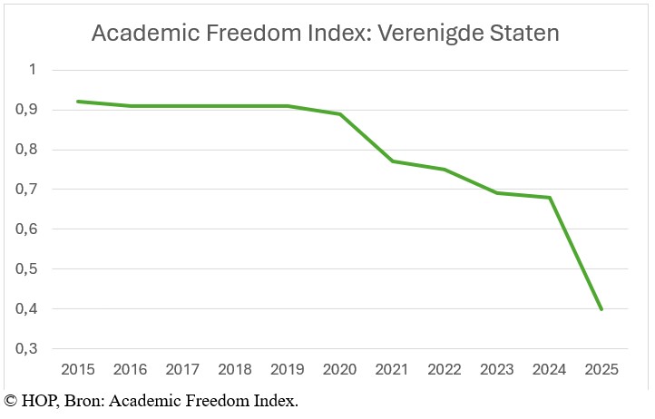 De meest spectaculaire afname is te zien in de Verenigde Staten, waar de academische vrijheid met maar liefst vijftig procent is gedaald. Met een score van 0,40 zou de academische vrijheid daar nu zelfs nog beperkter zijn dan in Nederland tijdens de Tweede Wereldoorlog.