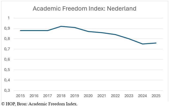 Ook wetenschapsgenootschap KNAW waarschuwde vorig jaar dat de academische vrijheid in Nederland onder druk staat, onder andere vanwege de forse bezuinigingen van het kabinet-Schoof en de ‘polarisering en verharding van het maatschappelijke debat’. De KNAW noemde daarbij ook de dalende score voor Nederland op de Academic Freedom Index.