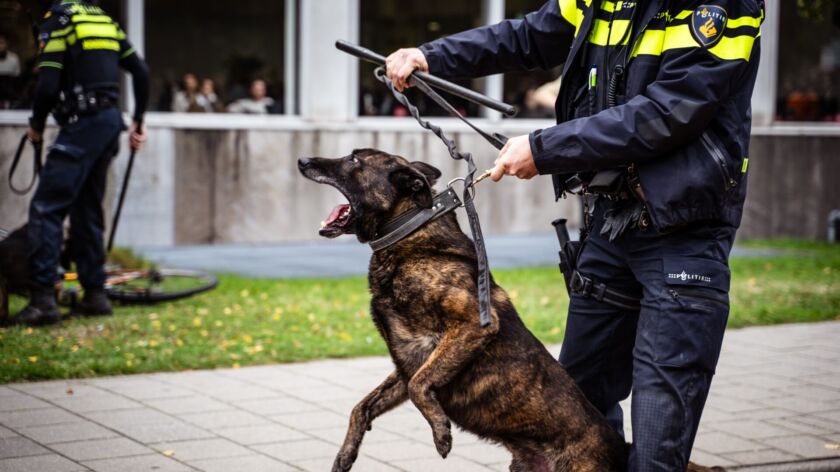 In Nederland nam het onveilige gevoel op campussen toe, onder andere door hardhandige politieoptredens bij demonstraties. Politiehond bij pro-Palestina-demonstratie. Foto: Johannes Fiebig