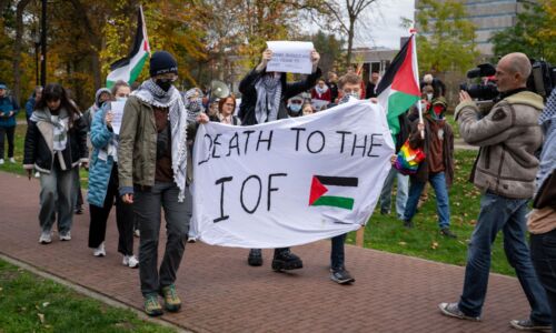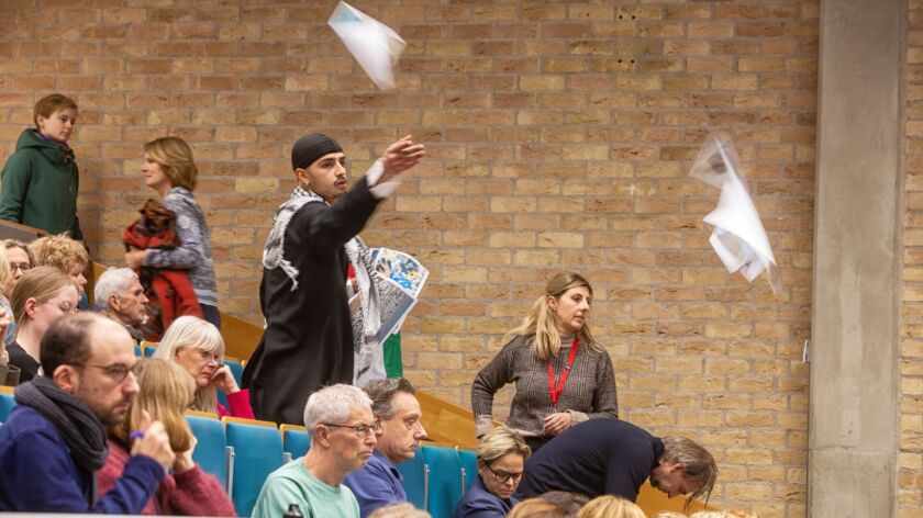 Na een korte presentatie door interim-directeur strategie en transitie Arjan-Tim Ferweda, kwam Alexandra van Huffelen naar voren om met de gespreksleider verder te praten over de strategie. Zodra zij het woord nam stonden drie pro-Palestina-activisten op. Ze gooiden foto’s van zwaargewonde oorlogsslachtoffers door de collegezaal, en riepen “cut the ties” en “shame”. Pogingen van de gespreksleider en de collegevoorzitter om de demonstranten te vragen op een later moment verder te praten, liepen op niets uit.