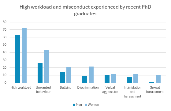 44 percent of recent female PhD graduates reported experiencing unwanted behaviour during their PhD. Among men, this figure was significantly lower, at 26 percent.
