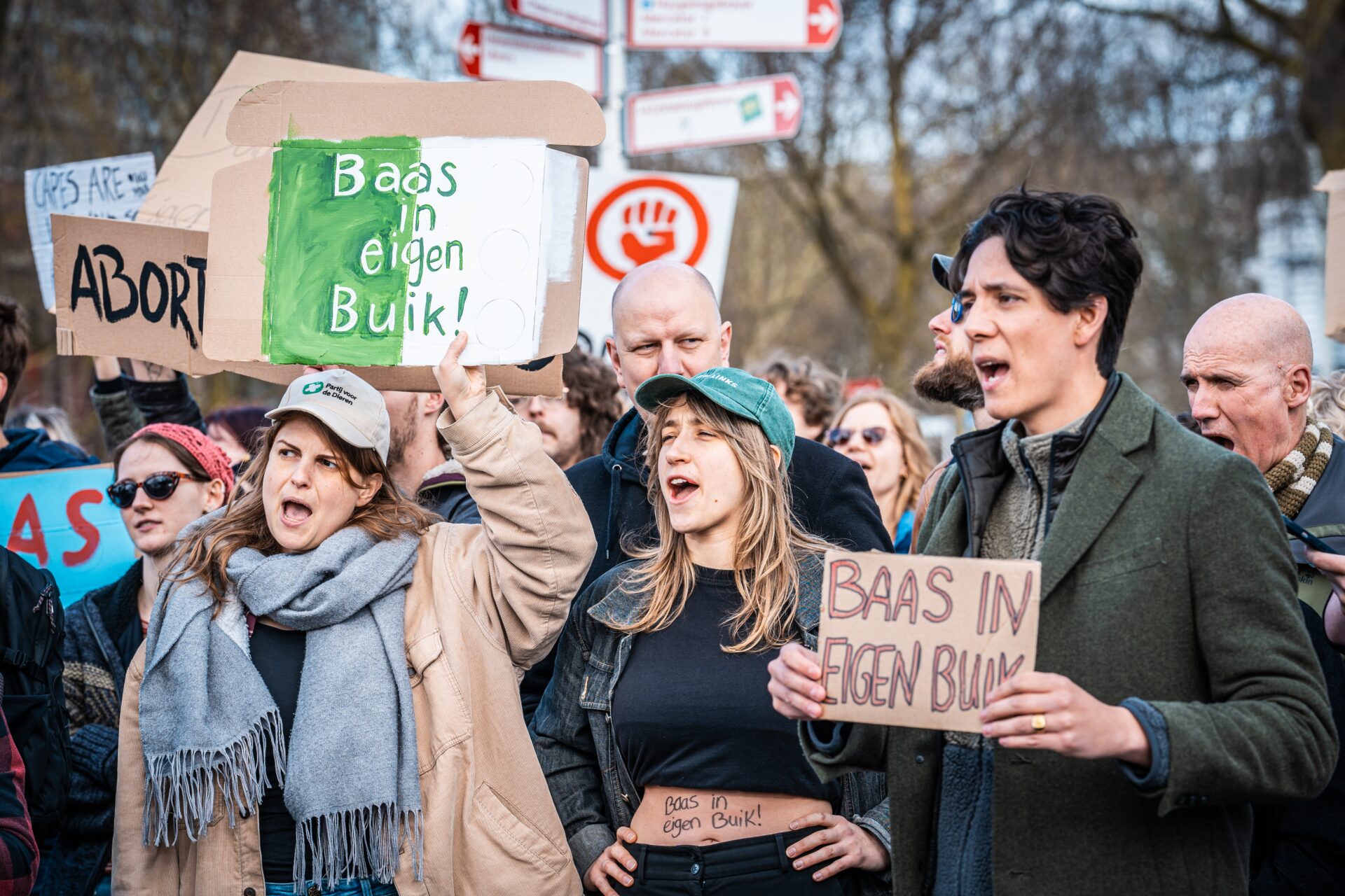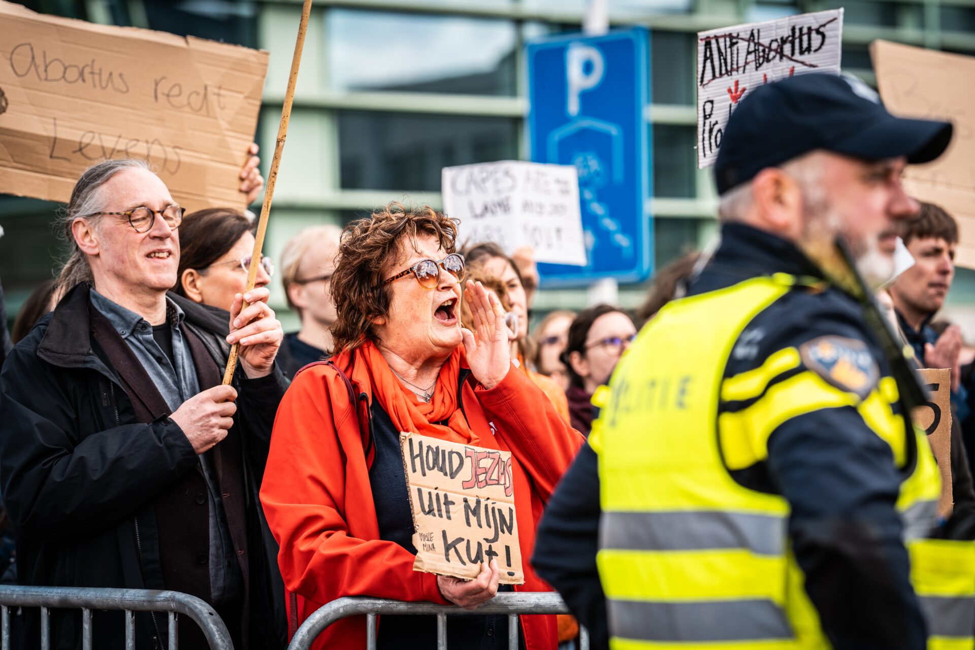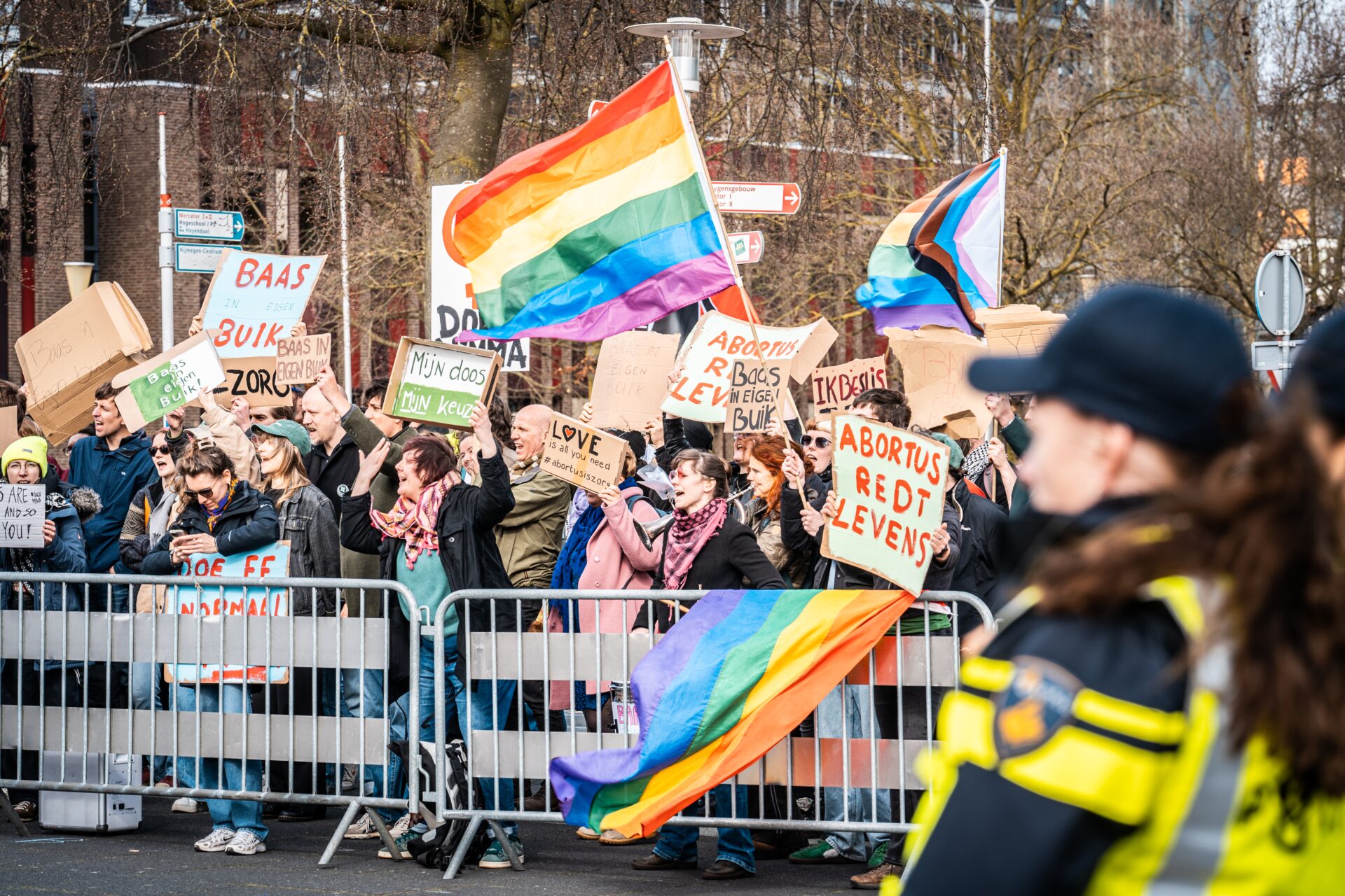 De tegendemonstratie, een bonte mengeling van Dolle Nimma’s, pro-Palestinademonstranten en leden van verschillende politieke partijen, is zeker zes keer zo groot. Ze zwaaien met regenboogvlaggen en borden met feministische leuzen en draaien muziek van Cher en Sophie Straat. Op aangeven van de politie staan ze achter enkele metalen hekken, op korte afstand van de anti-abortusdemonstranten.