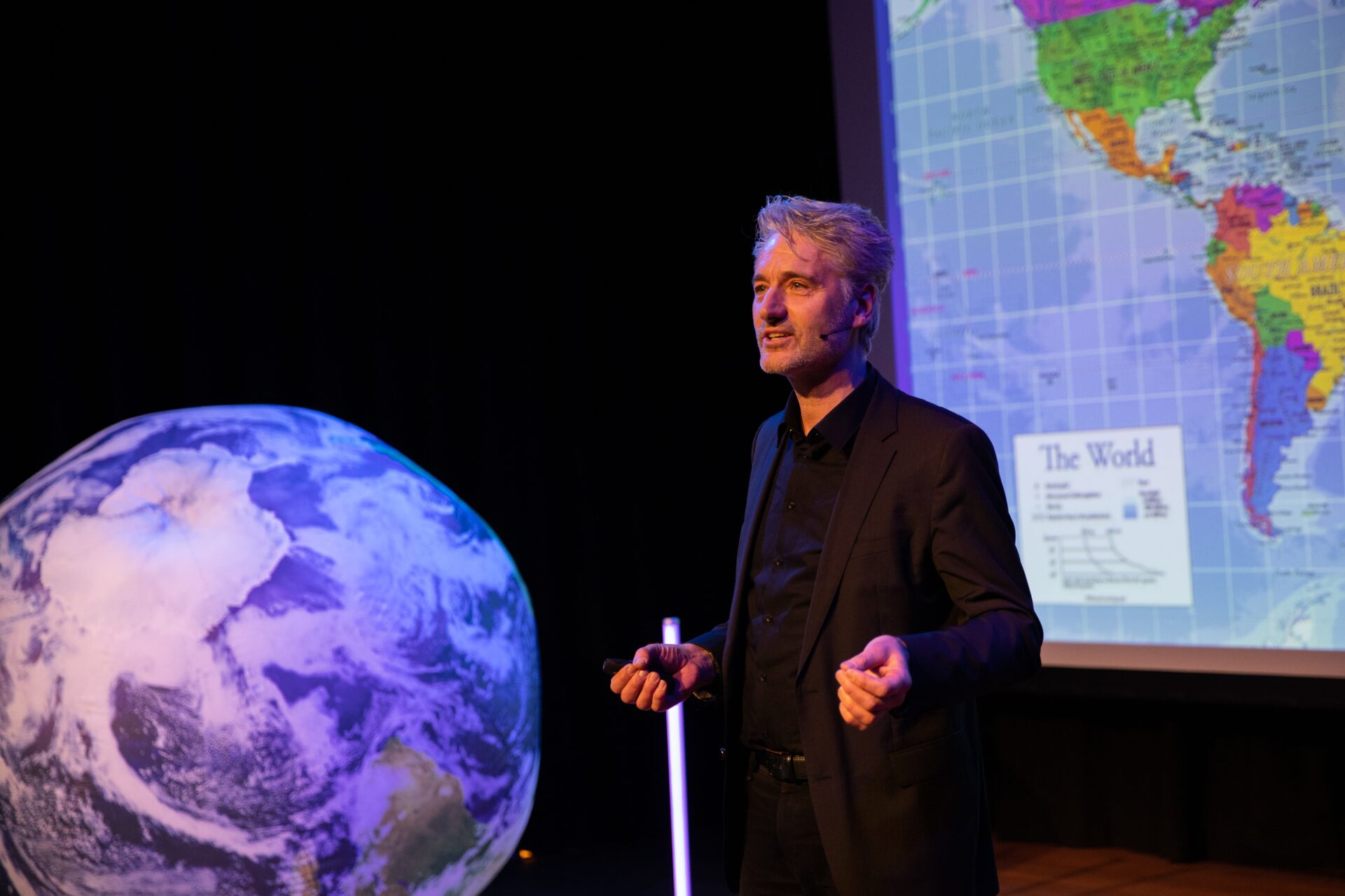 Hoogleraar Sociale Geografie Henk van Houtum houdt een minicollege onder andere over hoe de projectie van de wereldkaart het denken bepaalt. Hendriks: ‘Nijmegenaren en mensen uit het oosten van het land – zelf ben ik afkomstig uit Gennep – groeien bijvoorbeeld op het met het idee dat ze decentraal wonen, ver van het westen en van Den Haag. Hoewel Duitsland amper zes kilometer verderop ligt, zijn we daar minder op gericht. Terwijl we toch veel delen met mensen aan de andere kant van de grens.’