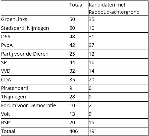 En ook de lijsttrekkers van acht van de dertien deelnemende partijen aan de gemeenteraadsverkiezingen zijn Radboudalumni, namelijk die van GroenLinks, D66, PvdA, de Partij van de Dieren, SP, VVD, CDA en RSP.