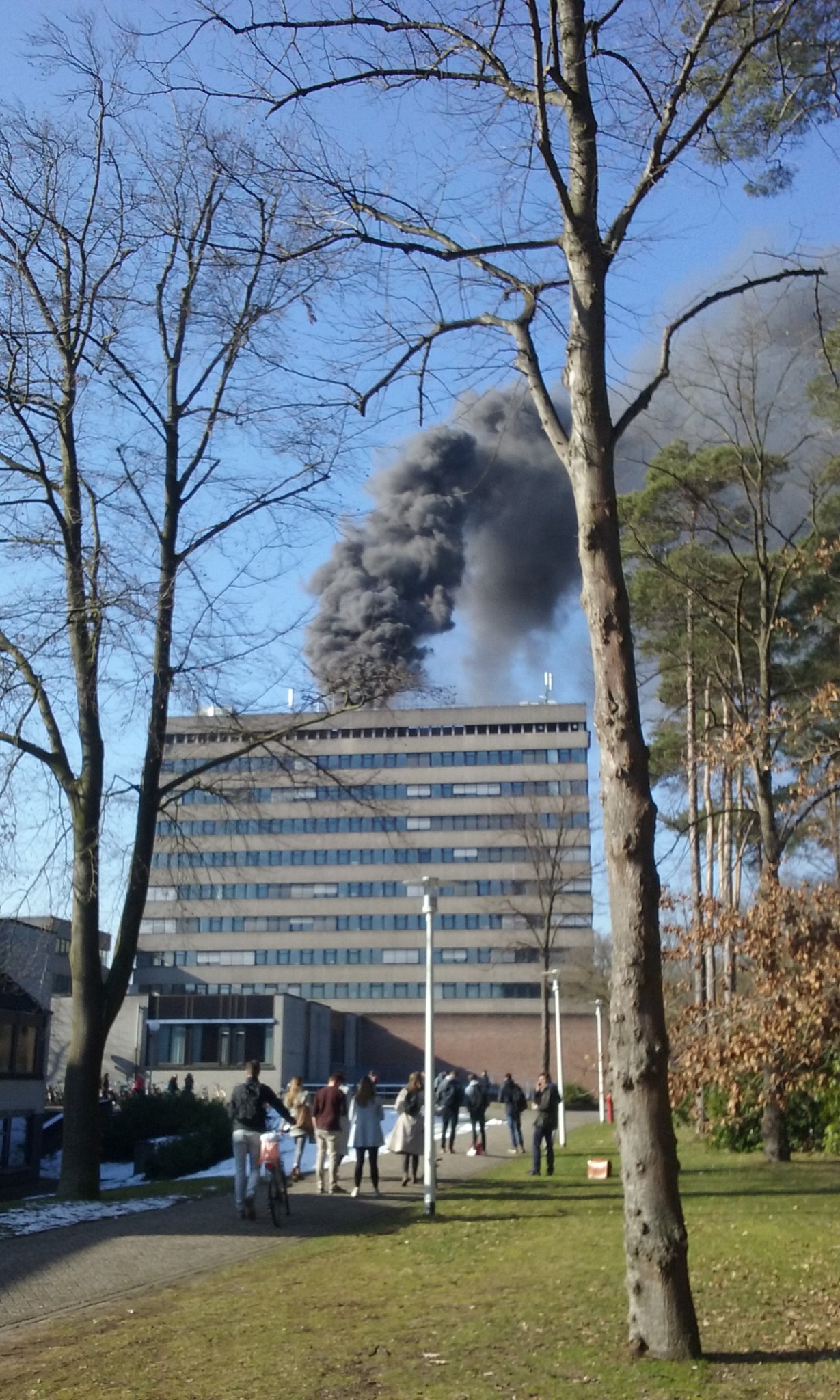 Update 12.50 uur: ‘Wij waren beneden in de kantine aan het pauzeren’, zeggen twee psychologiestudentes die bij het fietsenrek staan tegenover de hoofdingang van het Spinozagebouw. ‘Opeens hoorden we iemand omroepen dat we naar buiten moesten en dat je de lift niet meer mocht gebruiken. Dat was wel even spannend ja.’ Ze kijken nog eens omhoog naar de rookwalm uit het Spinozagebouw.
