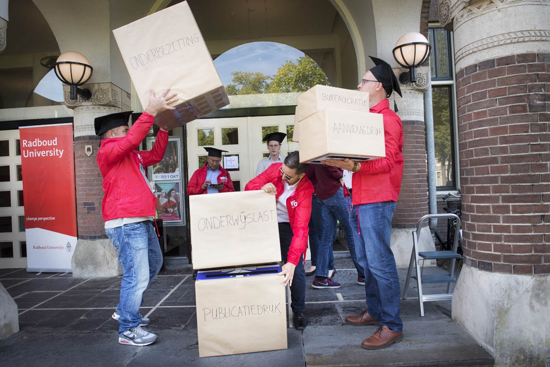In de hal van de Vereeniging voerde vakbond voor de wetenschap VAWO een actie tegen de almaar oplopende werkdruk, samen met de netwerken van postdocs en promovendi. Volgens cijfers van VAWO is 20 procent van de wetenschappelijke arbeid aan universiteiten onbetaald overwerk, verricht in avonduren, weekenden en vakanties. Omgerekend naar loonkosten komt VAWO op een bedrag van bijna 300 miljoen euro. VAWO heeft een cheque van dit bedrag vanmiddag overhandigd aan minister Jet Busssemaker.