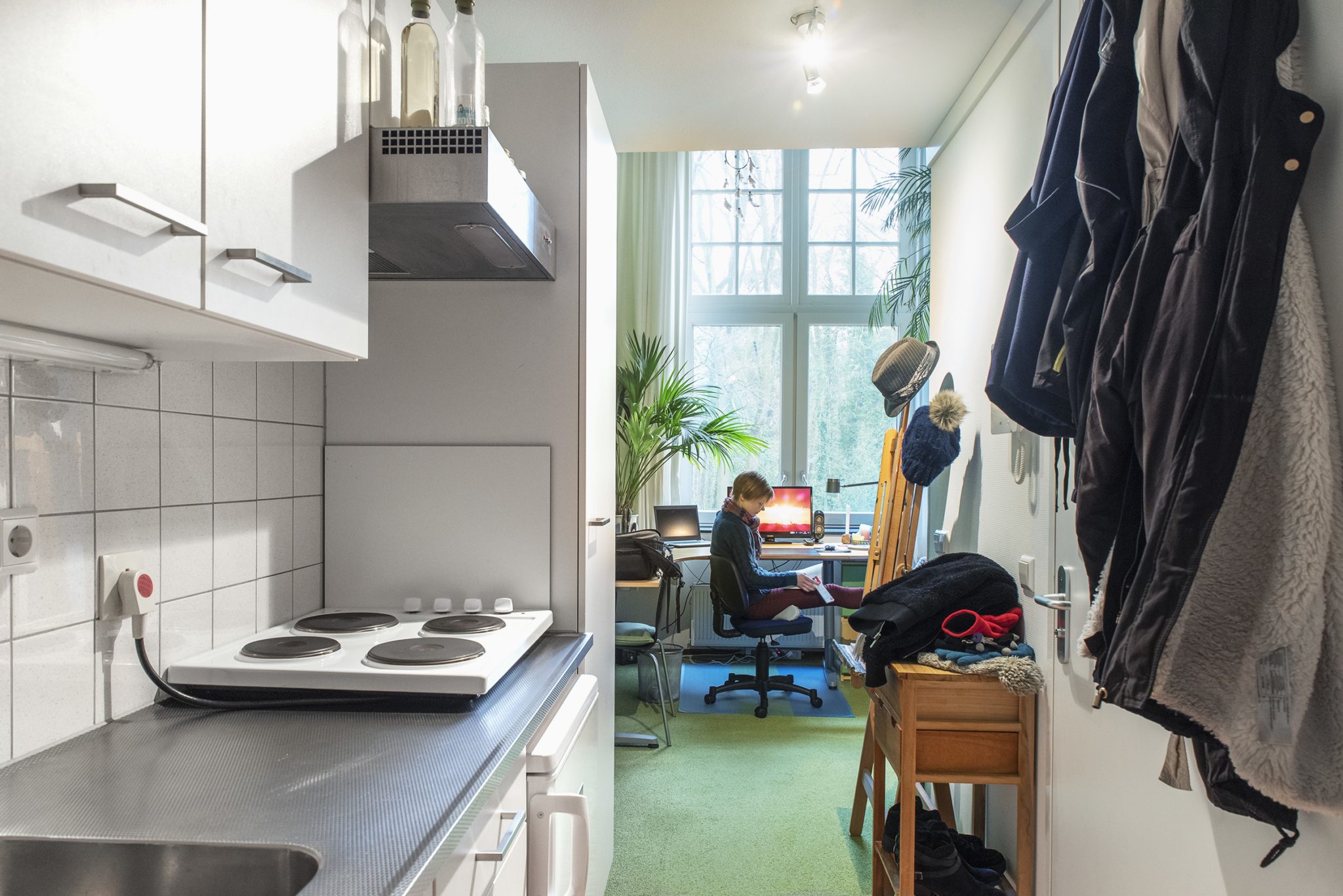 Tönissen woont nu vier jaar in een studio van achttien vierkante meter met een hoog plafond in Mariënbosch, een oud klooster aan de Groesbeekseweg dat in 2015 is omgebouwd tot studentencomplex. Bij binnenkomst is links haar keukentje, rechts de deur naar de badkamer. Op de vloer ligt felgroen tapijt. ‘Daar was nog een stukje van over bij de winkel, ik kon het met veel korting meenemen’, zegt de masterstudent. ‘Toen dacht ik: dan verf ik de muur ook groen. Sprinkhaangroen heet deze kleur.’