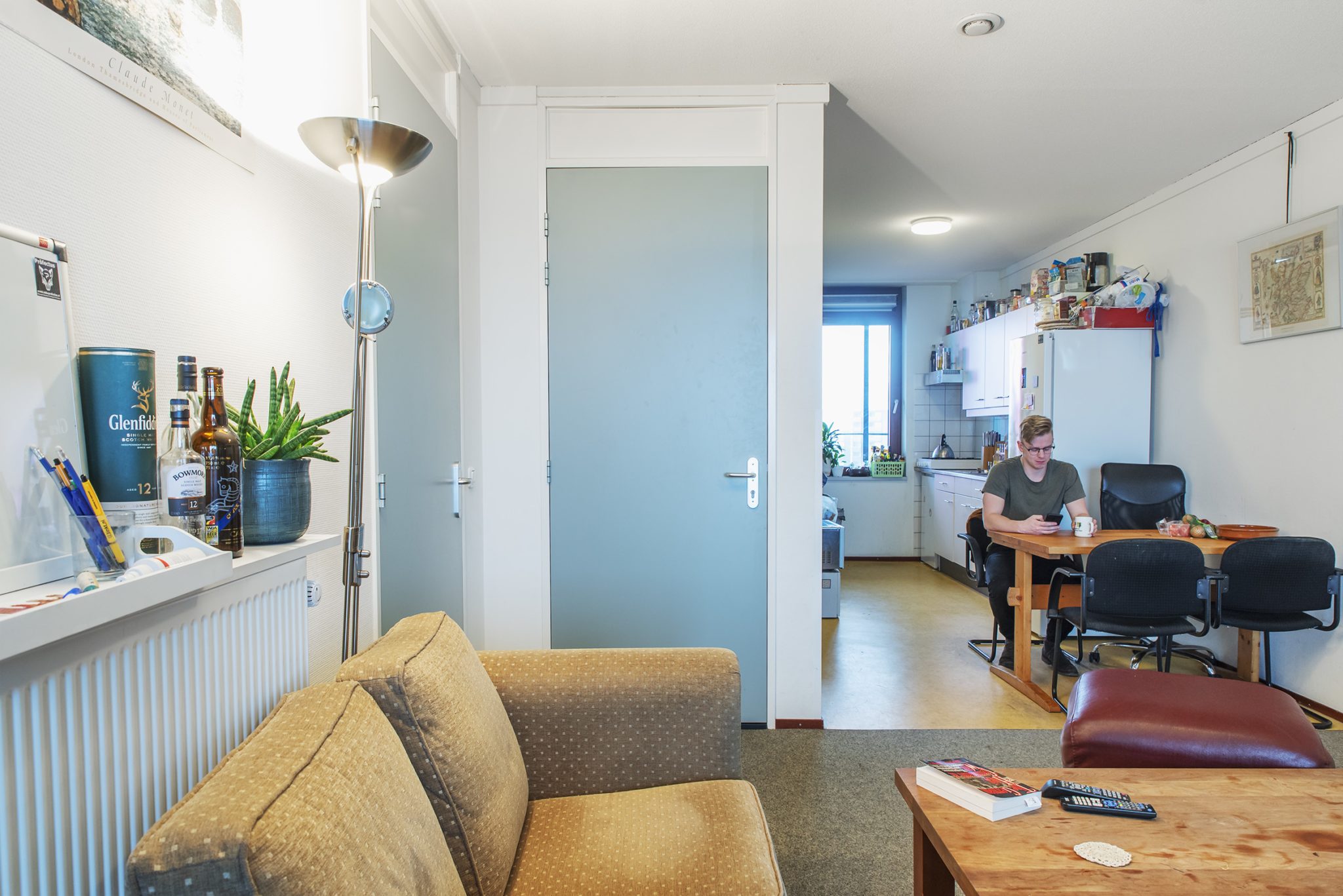 In een verlaten keuken annex woonkamer – zijn huisgenoten zijn voor het weekend naar hun ouders – schenkt hij koffie in twee Radboudmokken. De ruimte op de zesde verdieping lijkt meer op een appartementje dan een studentenhuis, al bestaat de inrichting uit een studentikoos samenraapsel van toevallige vondsten: een houten tafel, een bank, een tv, een kast.