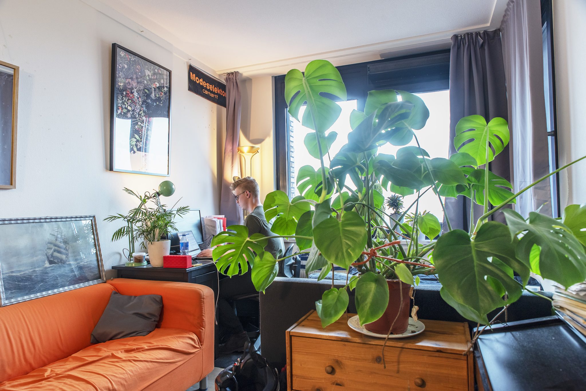Zijn eigen kamer is met zo’n vijftien vierkante meter ruim genoeg om in te slapen, studeren en wonen. Bij het raam staan niet minder dan acht planten. Een uit de hand gelopen hobby, vertelt de student lachend. ‘Ik kocht ze ooit als stekjes, inmiddels zijn ze allemaal groot gegroeid.’ De kunstzinnige posters aan de muren komen ‘gewoon van IKEA’, de houten kast mocht hij bij zijn ouders meenemen. ‘Deze kamer is groter dan mijn vorige twee. Hij voelt ook ruimer. Op Galgenveld keek ik door mijn miniraampje uit op een betonnen muur – nu heb ik uitzicht over de hele stad.’