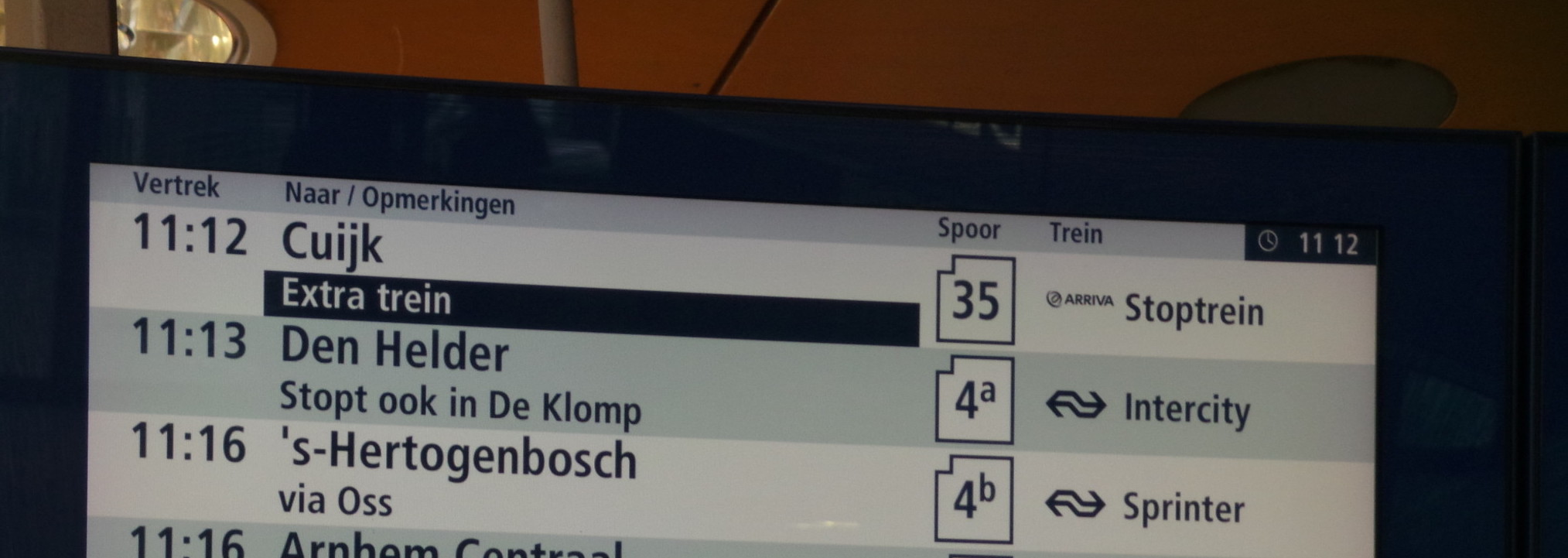 Het NS-personeel loopt goedlachs door de stationshal en helpt zelfs met de laatste versieringen. ‘Kijk! Geschminkt door de NS,’ zegt Lottie vrolijk, wijzend op de blauwe en gele letters op haar wang die het woord UNOX vormen. Gisteren is ze van Groningen naar Nijmegen gekomen om met haar Friese vriendin Neeltje-Anna naar Kuuk te gaan. ‘Ik heb een tijd lang in Nijmegen gewoond en gestudeerd’, zegt Neeltje-Anna, ‘en sindsdien is de Kuukse kroegetocht een traditie geworden. We proberen elk jaar vroeg weg te gaan, maar moeten op het station altijd nog veel doen.’ Hoewel de twee, verkleed als schaatsers, het jammer vinden dat er ook dit jaar waarschijnlijk geen Elfstedentocht geschaatst gaat worden, gaan ze hard hun best doen om de elfkroegetocht wel te voltooien. ‘Carnaval is elk jaar weer erg gezellig. Soms denk ik dat ik in de verkeerde provincie geboren ben’, besluit Neeltje-Anna.