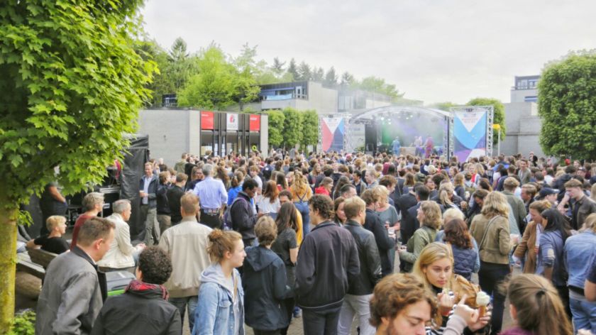 Het festivalterrein druppelt vol, terwijl Lucas Hamming richting het einde van zijn optreden gaat. De collega’s van Campus in Beeld hebben het beste uitzicht. Zij zitten op een balkon van het Erasmusgebouw, waar ze alle artiesten zullen interviewen. Het resultaat zullen ze dinsdagavond op hun website zetten.
