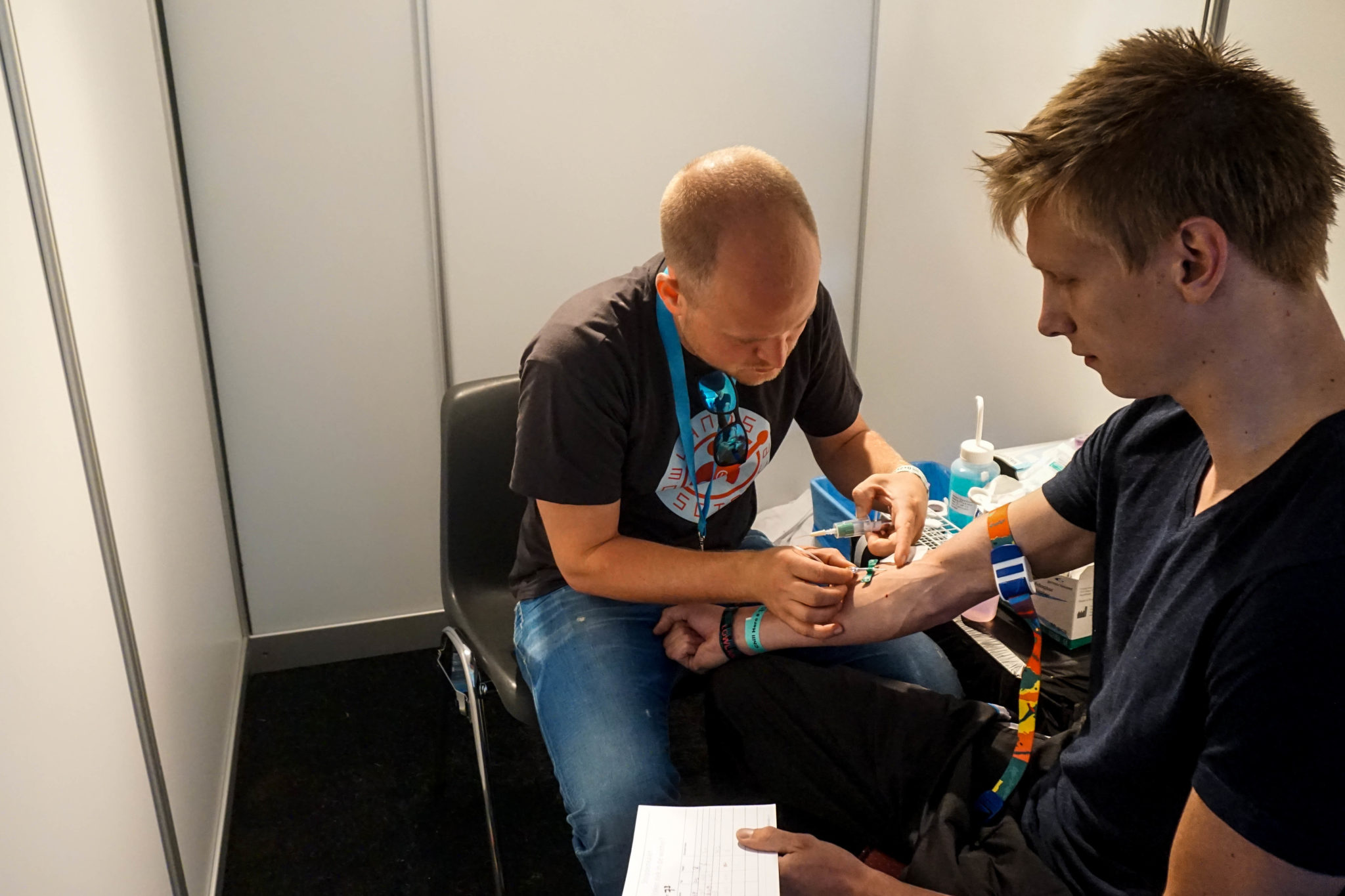 Boeijen moet eerst blazen. ‘0,00 is het alcoholpromillage in je bloed’, meldt de onderzoeker. ‘Da’s zwaar onmogelijk!’ reageert vriend Artz. Vrijdagavond wilden de vrienden al meedoen aan het Nijmeegse onderzoek, maar toen hadden ze te veel gedronken. Alcohol beïnvloedt het afweersysteem, en daarom moeten de deelnemers nuchter zijn. Jeroen Boeijen is – ook tot zijn eigen verbazing – na een paar uur slapen dus helemaal ‘clean’. In een hokje wordt bloed afgenomen en vlak voor hij het dompelbad instapt, wordt zijn temperatuur gemeten.