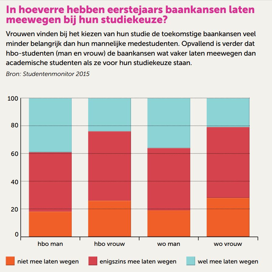 De jaarlijkse Startmonitor vraagt ieder jaar aan eerstejaarsstudenten wat hun belangrijkste motieven waren om voor hun studie te kiezen, waarbij meerdere antwoorden mogelijk zijn. Het meest genoemde antwoord – met afstand – is dat ze de studie inhoudelijk interessant vinden (94 procent). Op twee staat de aansluiting op iemands capaciteiten (76 procent) Daarna volgen de brede beroepsmogelijkheden (60 procent) en de baankansen (42 procent). 29 procent heeft ook voor zijn of haar studie gekozen voor het hoge salaris. Opvallend is dat de arbeids- en salarisgerelateerde motieven om voor een studie te kiezen sinds het hoogtepunt van de financiële crisis steeds onbelangrijker worden. Blijkbaar hebben studenten weer steeds vaker het vertrouwen dat het op de banenmarkt wel goed komt.