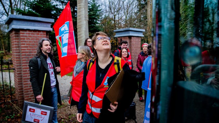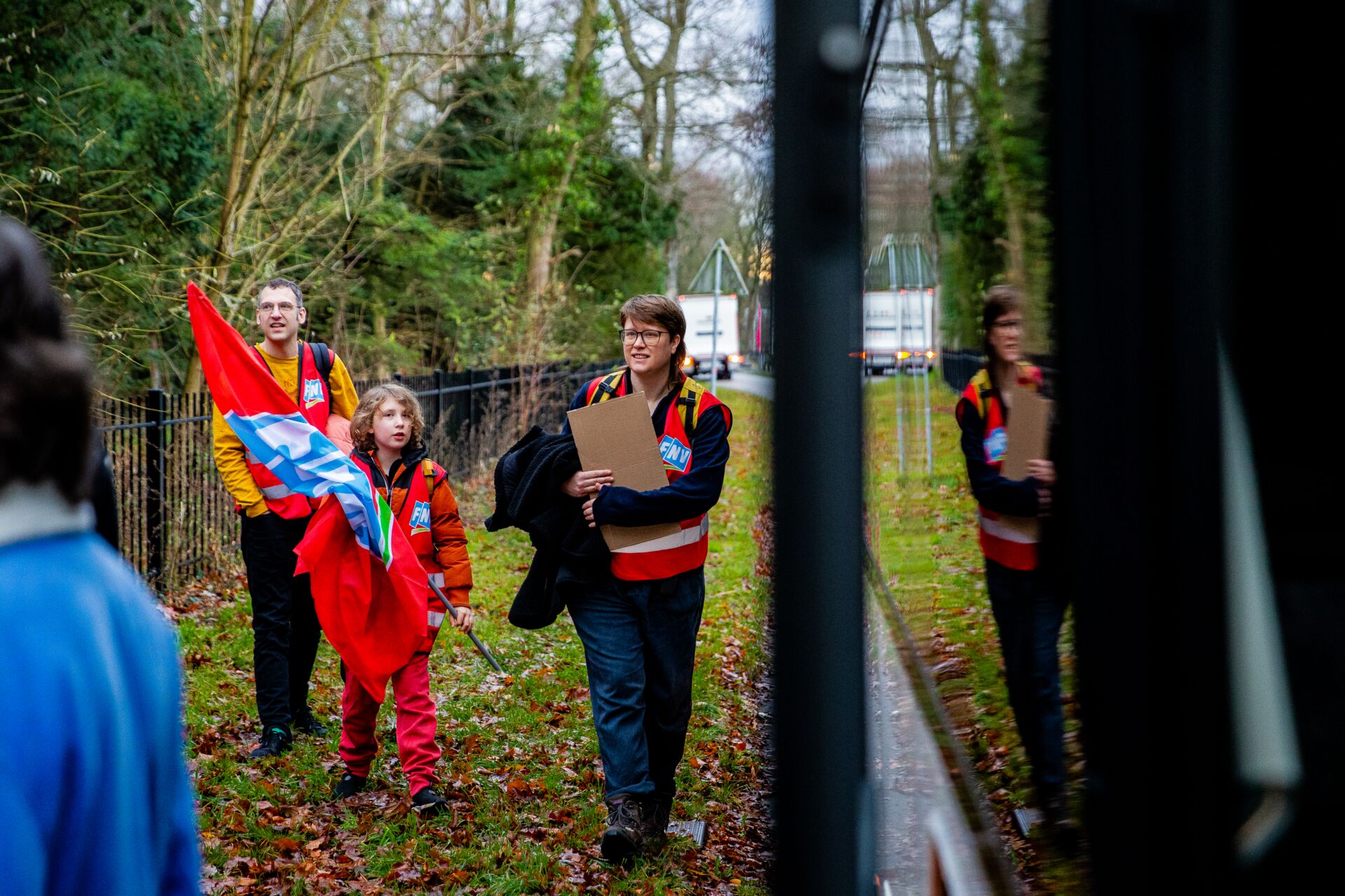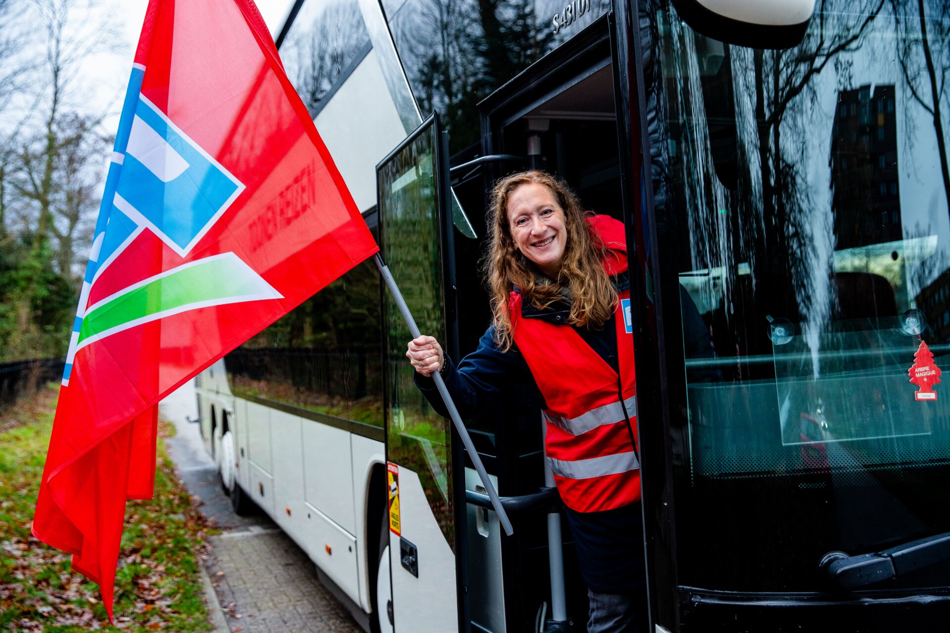 De bus zit vanochtend voor driekwart vol, constateert Scherps als ze op haar telefoon de afmeldingen doorneemt terwijl de stok met daaraan de FNV-vlag op haar schouder rust. ‘Het grootste deel van de collega’s gaat met het openbaar vervoer, velen wonen ook dichter bij Amsterdam. Gelukkig luistert de FNV heel goed naar wat we willen, dus als je een bus vraagt dan komt die er ook.’
