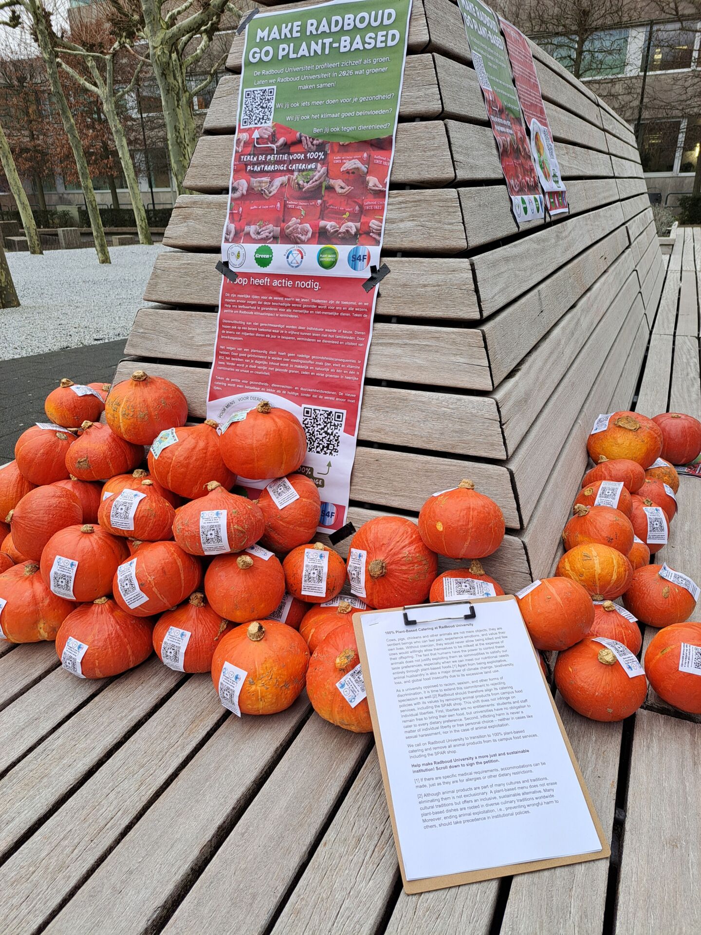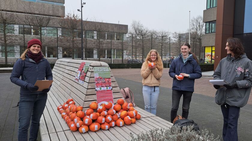 Actievoerders deelden vandaag 120 pompoenen uit op de campus van de Radboud Universiteit. Met twee redenen: voedselverspilling tegengaan én het gesprek over klimaatverandering aangaan. De actie was een succes: de pompoenen waren binnen no time weg.