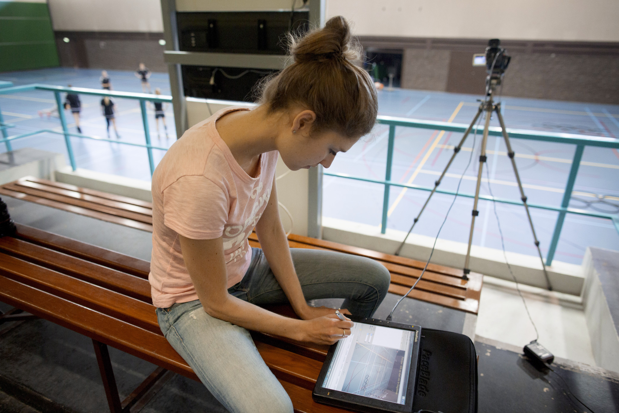 Hamers is masterstudent Sport Science aan de Rijksuniversiteit Groningen en stagiair op Papendal. Ze verzamelt data over de training. Het programma dat ze gebruikt, brengt de exacte locatie van spelers op het veld in kaart. ‘Dat is handig, want de trainer kan zo precies het positiespel overzien.’