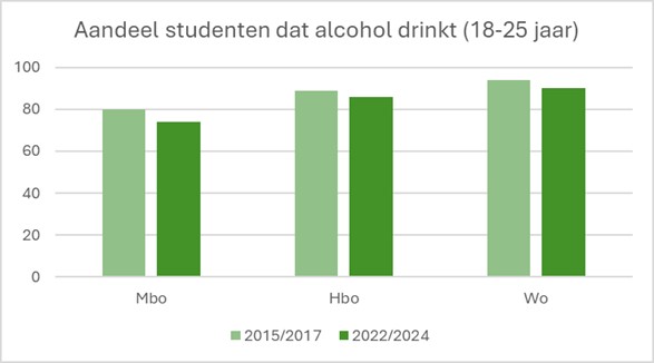 Dat is 6 procentpunt minder dan in het vorige onderzoek over 2015/2017. Toen zei 86 procent van de jongeren tussen de 18 en 25 jaar alcohol te drinken. Onder wo-studenten wordt nog altijd het meest gedronken: negentig procent. In het hbo is dat 86 en in het mbo 74 procent.