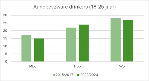 Het aandeel ‘zware drinkers’ onder jongeren daalt echter nauwelijks. In het hbo is zelfs sprake van een stijging. Zo’n één op de vier studenten in het hoger onderwijs nuttigt minstens één keer in de week zes glazen (mannen) of vier glazen (vrouwen).