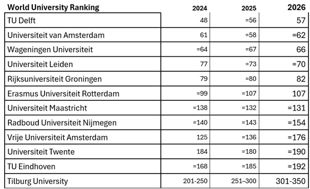 Nederland is met elf universiteiten nog altijd goed vertegenwoordigd in de top-200 van de World University Rankings 2026. Toch moeten acht van hen opnieuw een stapje terug doen. De TU Delft staat net als de afgelopen twee jaar het hoogst op de lijst van de Nederlandse universiteiten, maar ook deze instelling is een plekje gezakt: van 56 naar 57.