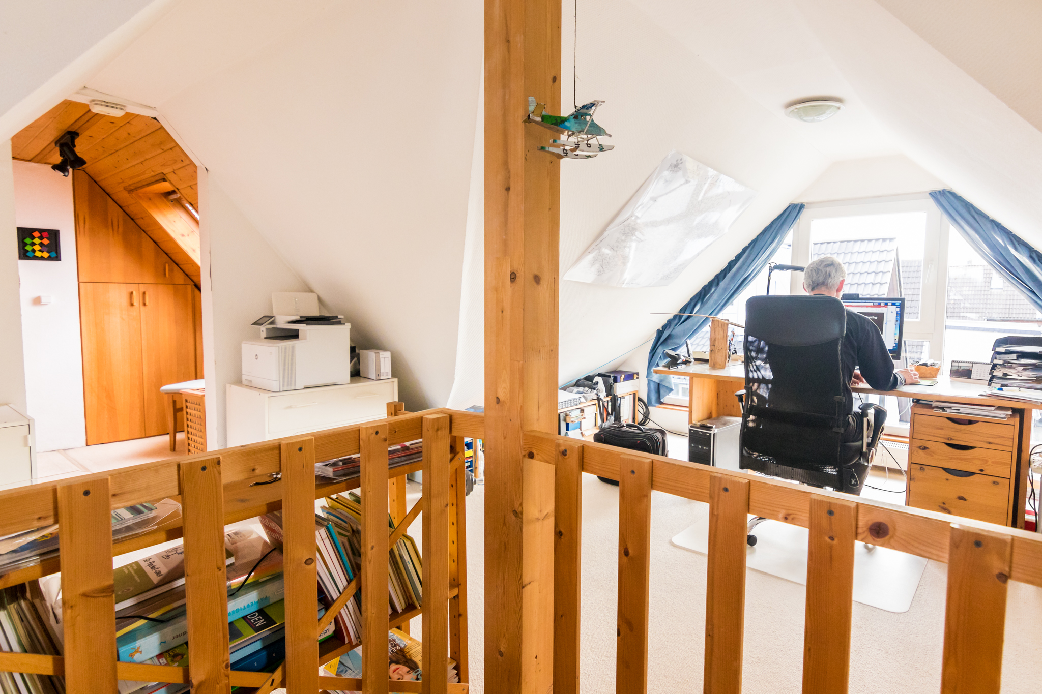 ‘Dit is een mijnwerkershuis, gebouwd door mijn schoonfamilie’, vertelt Heino Falcke. ‘Mijn schoonmoeder woont beneden, wij boven. Vroeger met z’n vijven, inmiddels wonen twee kinderen op zichzelf: alleen de jongste is nog thuis. Ja, het plafond lijkt op dat van een kathedraal, dat is toeval.’
