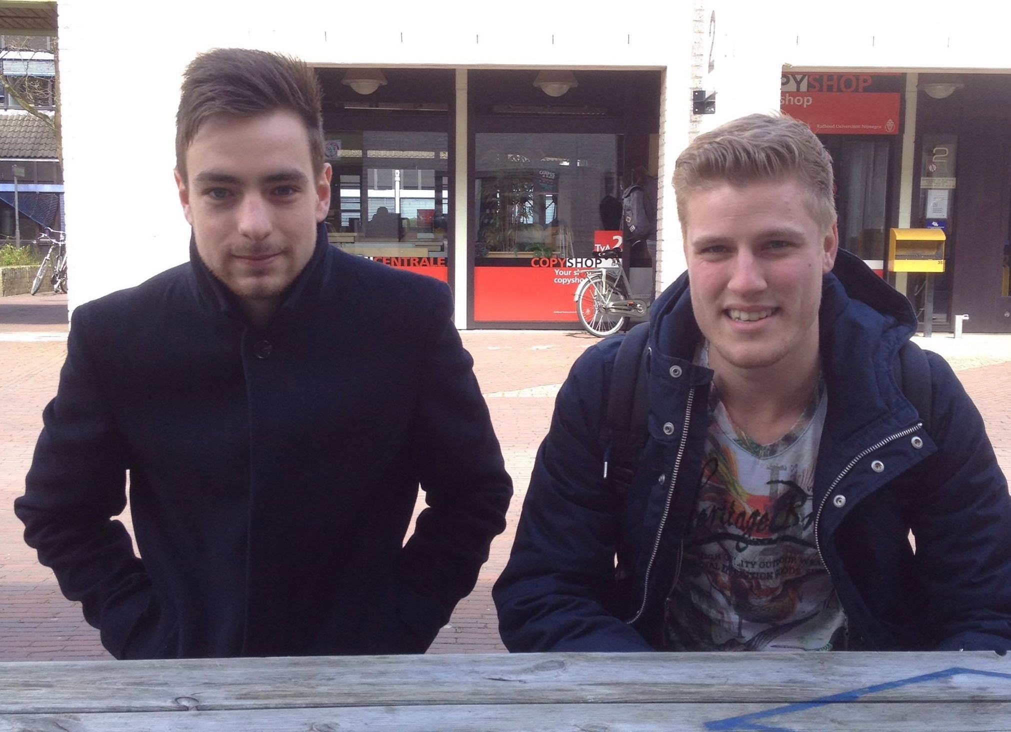 Okko Kruijshoop (22, links op de foto) en Guus Jacobs (23), beiden student bestuurskunde: