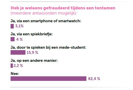 Om dat te checken hield Vox een enquête onder ruim 200 studenten. Fraude met telefoons en smartwatches is tamelijk zeldzaam, net als het old school gebruik van een spiekbriefje. Het afkijken bij een medestudent is daarentegen stukken populairder. Vrouwelijke studenten lijken wat braver dan de mannelijke. In iedere categorie vonden we (veel) meer mannelijke valsspelers, terwijl we 137 vrouwen spraken en maar 90 mannen. Geen van de ondervraagden zegt ooit gestraft te zijn voor fraude.
