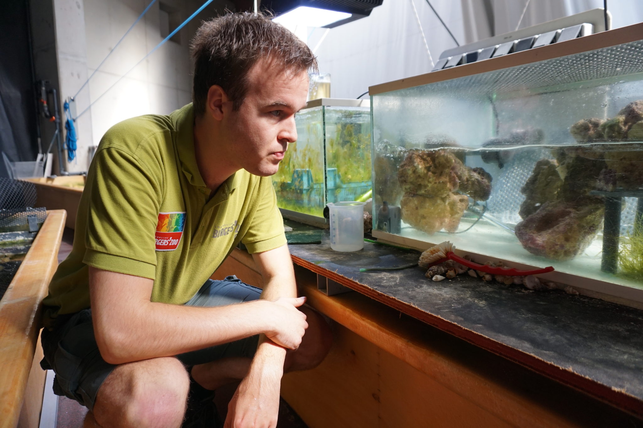 Het Arnhemse kantoortje waar Kenny Schilderman zijn stageverslag schrijft, ligt boven het haaienverblijf. Soms helpt hij mee met de verzorging van de dieren. Al op zijn tweede dag in Koninklijke Burgers’ Zoo was hij van de partij toen de roggen werden gevoerd. Maar zijn eigenlijke werk ligt even verderop: Kenny doet onderzoek naar de klei in de net geopende Mangrove. Hij was het die concludeerde dat klei uit het Friese Kimswerd het meest geschikt zou zijn om te dienen als leefgebied voor wenk- en degenkrabben.