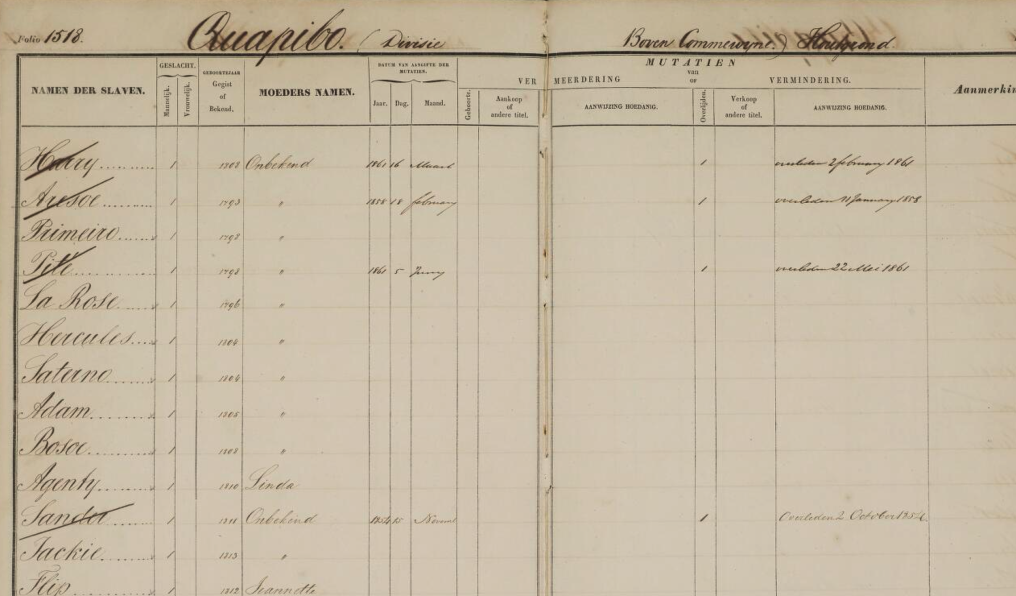 De ingescande pagina’s uit het register, ruim zeventigduizend in totaal, voerde Van Galen in op velehanden.nl, een crowdsourcingwebsite om collecties van archieven en musea te ontsluiten. ‘Daar gingen vrijwilligers ermee aan de slag: zij tikten de informatie uit het register over. De naam van de tot slaaf gemaakte, het geslacht, de geboortedatum. Maar ook de naam van de moeder en zijn of haar “mutatiedatum”.’