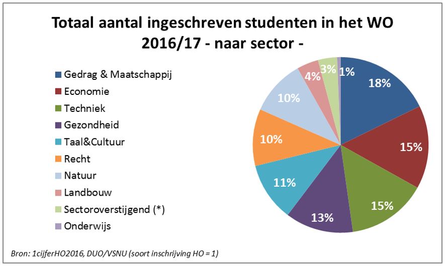 [kader-xl]De stijging komt voornamelijk door de grotere instroom van vwo’ers (5,2%) en internationale studenten (+27,3%) ten opzichte van vorig jaar die beginnen met hun bachelor. Het aantal uitgereikte diploma’s is ongeveer gelijk gebleven. De sector techniek en natuur zien de grootste stijgingen, met in vijf jaar tijd respectievelijk 24,3% en 21,8% groei, alhoewel rechten, psychologie en geneeskunde de grootste studies blijven.