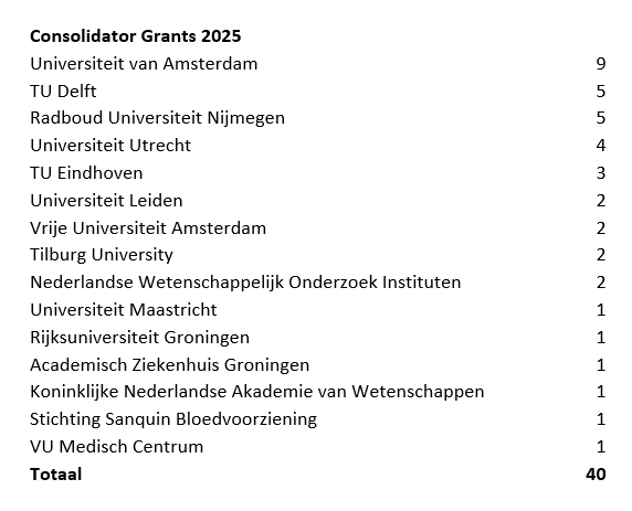 In totaal verdeelde de ERC 728 miljoen euro onder 25 EU-landen, en aan andere landen die meebetalen aan onderzoeksprogramma Horizon Europe.