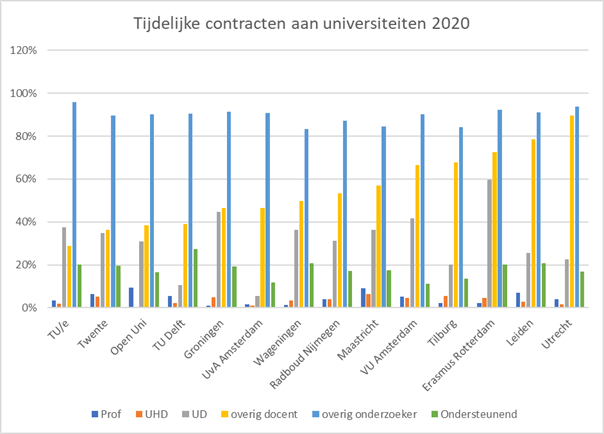 Het ondersteunend personeel, waaronder administrateurs en bibliotheekmedewerkers, treft het vooral goed aan de Vrije Universiteit Amsterdam (slechts 11 procent tijdelijk), terwijl de TU Delft op 27 procent uitkomt.