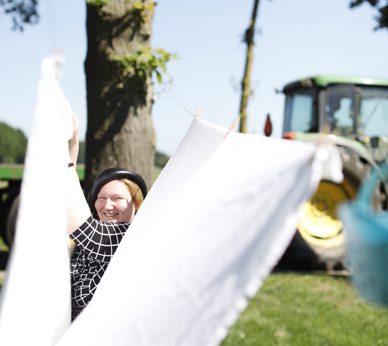 Op deze plek, op een prachtige junidag onder een strakblauwe hemel, houden we dit interview. ‘Nu ik geen rijbewijs meer heb, is het wel onhandig om hier te wonen’, zegt ze terwijl ze een rondleiding geeft over het terrein. Ze lijkt een dwergje tegen de achtergrond van de huizenhoge landbouwmachines.